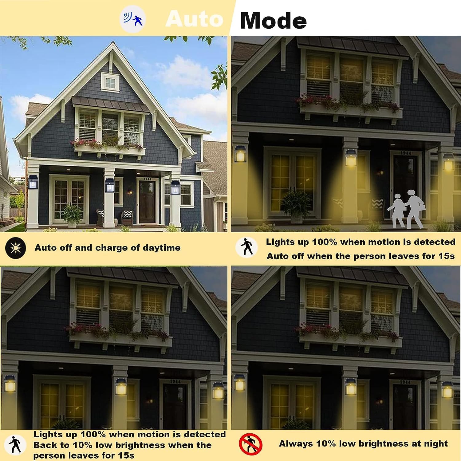 Auto ON/OFF Sensor: Automatically turns on at dusk and off at dawn. Operates up to 12 hours after a full charge. Ensure the switch is turned ON before first use.